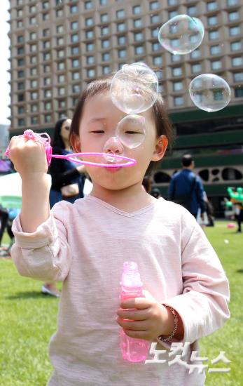 어린이날인 5일 오후 서울광장을 찾은 어린이들이 비눗방울을 불 즐거운 시간을 보내고 있다.