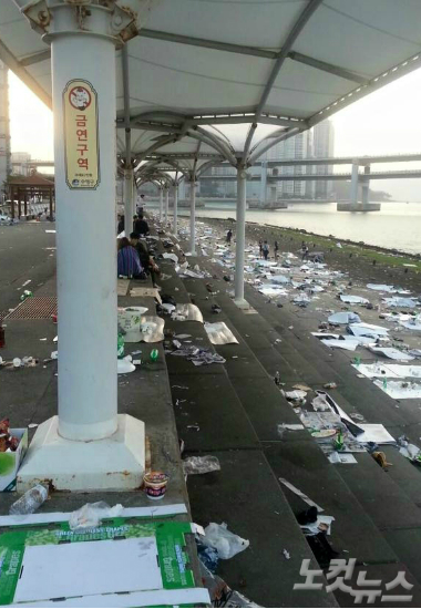 부산경찰과 수영구청 등에 따르면 사진의 모습은 밤사이 공원을 찾은 시민들이 사용한 쓰레기를 버리지 않고 방치하면서 만들어진 풍경이다.