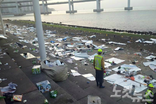 부산 수영구 민락동 수변공원에 연휴 동안 버려진 폐기물이 가득한 사진이 SNS에 올라와 시민의 공분을 사고 있다.