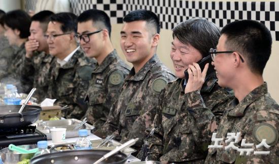 국민의당 안철수 공동대표가 12일 오전 경기도 연천의 전방 부대를 방문해 장병들과 점심식사를 하며 이상석 장병의 어머니와 통화를 하고 있다.