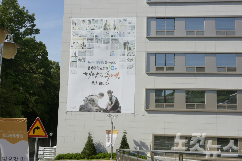 충북대병원 한 쪽 건물 벽면에 걸린 '태양의 후예' 현수막(사진 = 충북대병원 제공)