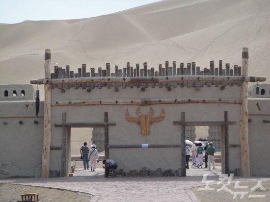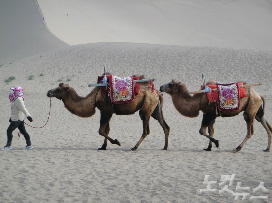 쌀알만한 모래와 돌이 퇴적되어 형성된 이 명사산은 일몰의 풍경이 천하의 절경이라 찾는 이가 많다. 여름에는 기온이 너무 높아 오후 4시 이후에 이동하는 것을 권하는데, 낙타를 타고 가는 이색 체험도 가능하다.