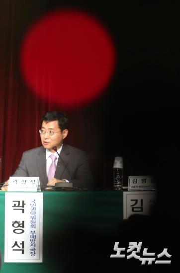 24일 오후 서울 중구 소공로 포스트타워에서 국민권익위원회 주최로 열린 '부정청탁 및 금품 등 수수의 금지에 관한 법률(일명 김영란법)' 시행령 입법예고안에 대한 공청회에서 곽형석 부패방지국장이 청탁금지법 입법예고안 주요내용을 설명하고 있다.