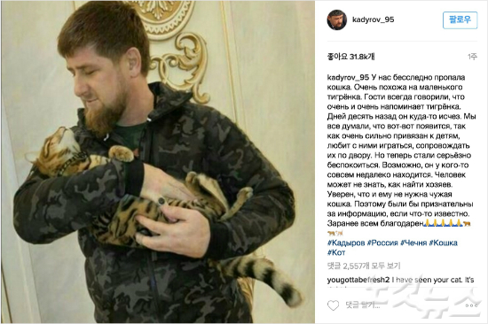 카디로프는 최근 자신의 인스타그램 계정에 집에서 키우던 고양이가 사라졌다며 아이들과 가깝게 지냈기 때문에 가족들이 심각하게 걱정하고 있다고 썼다.