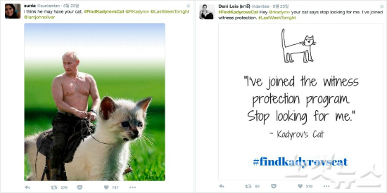 실제 트위터 이용자들은 해쉬태그를 이용해 “빨리 카디모프의 고양이를 찾아라. 그가 당신을 공격하기 전에..”라거나 “그가 당신 집을 부수기 전에 빨리 찾아라” 등의 농담을 올리고 있다.