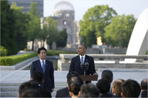 버락 오바마 대통령이 미국 현직 대통령으로서는 처음으로 27일(현지시간) 원폭 피폭지 히로시마의 평화공원을 방문해 원폭 희생자 위령비에 헌화하고 고인들을 추모했다. 그러나 그곳에서 불과 150m 떨어진 한국인 위령비는 별도로 찾지 않았다.