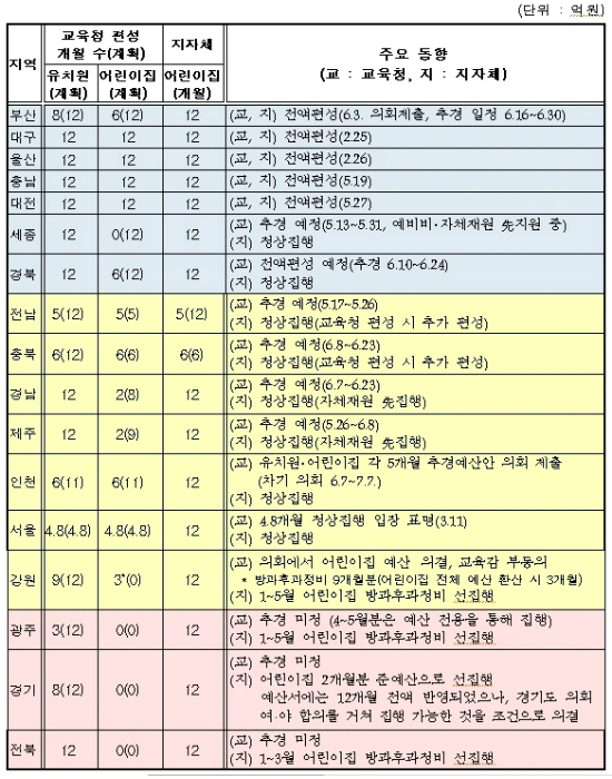 현재 유치원 또는 어린이집 누리과정 예산을 일부만 편성하거나 추가경정예산으로 편성할 계획이 없는 교육청은 서울, 인천, 광주, 경기, 강원, 충북, 전북, 전남, 경남, 제주 등 10곳이다.