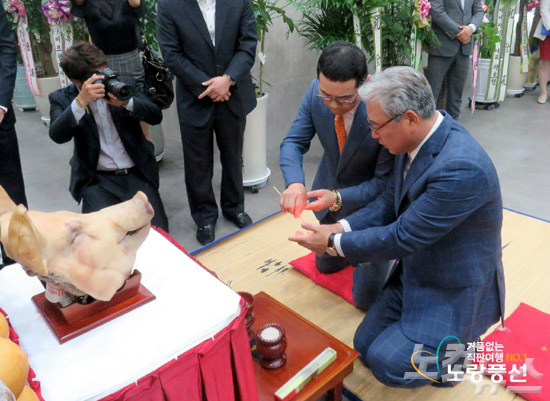 고사드리는 고재경, 최명일 노랑풍선 공동대표. (사진=노랑풍선 제공)