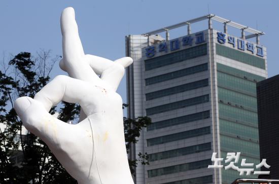 홍익대학교 정문 앞에 세워진 '일간베스트저장소(일베)'를 상징하는 손모양의 조형물을 두고 논란이 일고 있는 가운데 31일 오후 서울 상수동 홍익대학교 재학생들이 조형물을 지켜보고 있다.