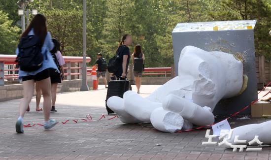 논란을 일으킨 '일간베스트저장소(일베)'를 상징하는 손모양의 조형물이 1일 오전 서울 마포구 홍익대학교 정문 앞에 파손된 채 방치돼 있다.