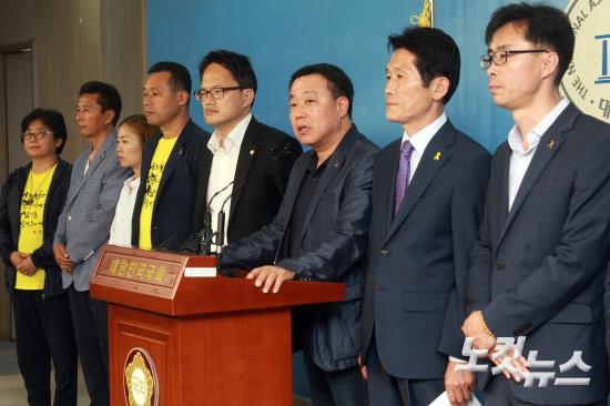 7일 국회 정론관에서 더불어민주당 박주민 의원과 정의당 윤소하 의원이 세월호 유가족들과 4.16 세월호 참사 진상규명 및 안전사회 건설 등을 위한 특별법 개정안 제출과 관련 기자회견을 하고 있다.