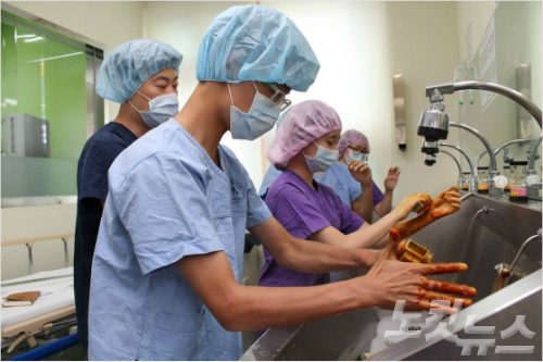 힘찬병원 의사 체험 인턴십 참가 학생들이 수술 전 손씻기 체험을 하고 있다.(사진=창원힘찬병원 제공)