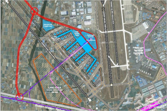 ADPi가 제시한 김해공항 확장안. 왼쪽에 사선으로 기울어진 활주로가 새롭게 건설되는 활주로다. 푸른색 부분은 새롭게 건설될 공항 터미널. (사진=ADPi 국토부 제공)