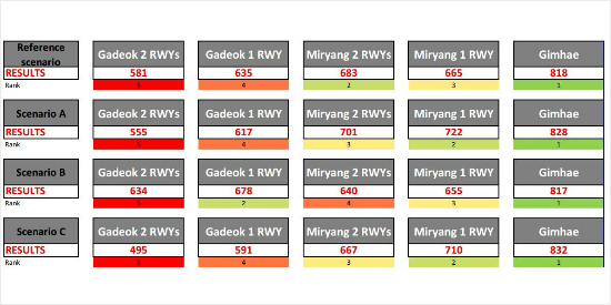 김해공항이 모든 시나리오에서 가장 점수가 높았지만, 특히 정치적 요인(legal/polotical challenges)이 포함된 위험성과 실행가능성(Risk&Deliverability)에 가중치를 둔 시나리오C에서 김해공항 확장안이 1000점 만점에 832점을 받았다. 2위인 밀양이 710점을 받은 것에 비해 점수가 120점 이상 월등히 높았다.