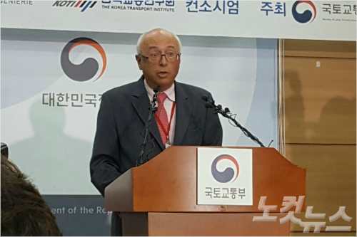 파리공항공단엔지니어링 장 마리 슈발리에 수석연구원이 21일 정부세종청사에서 영남권 신공항 사전조사 용역 결과를 발표하고 있다. (사진=장규석 기자)