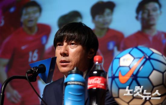 신태용 리우올림픽 축구대표팀 감독이 27일 오전 서울 광화문 교보생명빌딩에서 3명의 와일드카드(손흥민, 석현준, 장현수)를 포함한 18명의 올림픽 최종 명단을 발표 후 취재진의 질문에 답하고 있다.