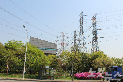 충남 서북부 지역에서 흔히 볼 수 있는 도심 속 송전탑들. 당진시에만 526개의 송전탑이 거미줄처럼 연결돼있다. (사진=신석우 기자)