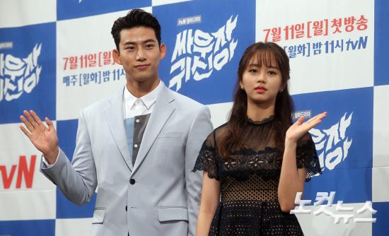 배우 옥택연과 김소현이 1일 오후 서울 논현동 임피리얼팰리스 호텔에서 열린 tvN 새 월화드라마 ‘싸우자 귀신아’ 제작발표회에 참석해 포즈를 취하고 있다.