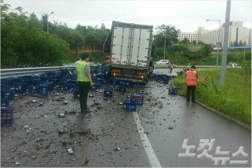 4일 오후 2시 10분쯤 충북 청주시 향정동 중부고속도로 상행선 서청주IC 인근 커브길을 지나던 A(45)씨의 25t 화물차에서 맥주 12,000병이 도로로 쏟아졌다.