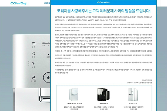시장 점유율 43%로 정수기 업계에서 1위를 달리고 있던 코웨이가 지금 중금속 검출 파동으로 홍역을 앓고 있습니다. 얼음이 나오는 정수기에서 얼음을 만드는 핵심 부품 ‘에바’라는 게 있는데요. 에바를 싸고 있는 니켈 도금이 떨어져나가는 현상. 이 현상이 발견된 겁니다.