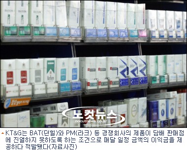 공정거래위원회는 18일 국내 담배시장의 70% 이상을 점유하고 있는 KT&G가 BAT(던힐 제조 판매)와 PM(라크 제조 판매), JTI(마일드 세븐 등 제조 판매) 등 경쟁회사의 제품이 담배 판매점에 진열하지 못하도록 하는 조건으로 매달 일정 금액의 이익금을 제공하다 적발돼 시정조치와 함께 5000만 원의 과징금을 부과했다고 밝혔다.