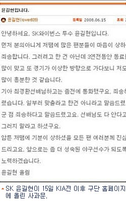 글이 아닌 윤길현의 진정성이 드러날 수 있는 사과 동영상이 올라왔으면 어땠을까 하는 아쉬움이 남습니다. SK는 통신회사가 있어 휴대폰으로도 간단하게 이 정도는 만들 수 있었을 텐데요. 만약에 진중한 태도의 사과에도 악의적인 댓글들이 빗발친다면 그것은 팬들의 자질 문제로 넘어갑니다.[BestNocut_R]