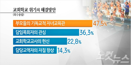 교회학교 위기의 해결방안으로 부모들이 기독교적인 자녀교육관으로 바뀌어야 한다는 응답이 가장 많았고, 이어 담임 목회자의 관심, 교회학교 교사의 헌신을 꼽았다.