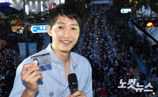배우 송중기가 14일 오후 서울 신촌 연세로에서 열린 ‘제2회 신촌 맥주 축제’ 에 참석해 소맥자격증을 들어보이고 있다.