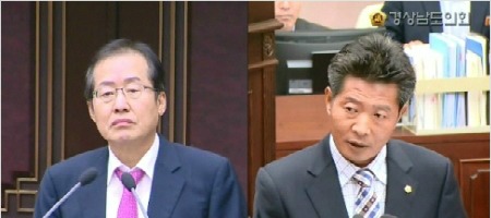 홍준표 경남지사와 여영국 도의원. (사진=경상남도의회 방송 캡처)