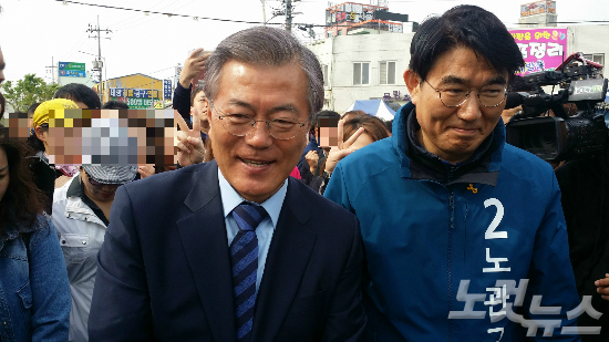 총선 당시 순천을 방문한 문재인 전 대표와 함께 한 노관규 전 순천시장. (사진=고영호 기자)