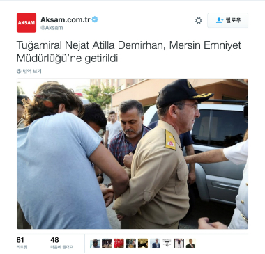 이와 관련해 터키의 인터넷 뉴스사이트인 ‘아크삼’은 '네자트 아틸라 데미르한' 해군 소장이 체포됐다고 체포장면 사진과 함께 밝혔다.