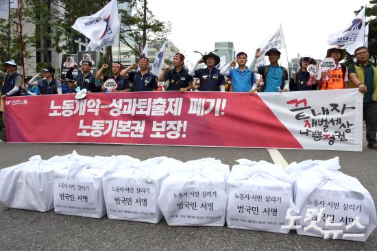 20일 오후 서울 여의도 산업은행 앞에서 열린 민주노총 총파업 총력투쟁 결의대회에 참가자들이 국회 앞까지 행진을 마치고 (쉬운해고 반대/재벌에게 세금을/최저임금 1만원)' 노동자.서민 살리기 범국민 서명을 내려놓고 구호를 외치고 있다.