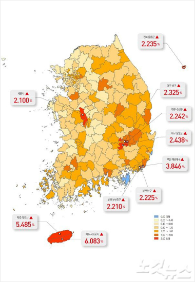 2016년 상반기 전국 지가상승 색인도 (자료=국토교통부)