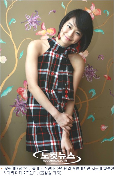 ''''''''무림여대생''''이 늦게 개봉하지만 밝고 명랑한 내용이라 여름에 잘 맞아 지금이 행복한 시기''''라는 신민아의 긍정적인 발상이 새롭다. 최근 불거진 그룹 빅뱅의 멤버 탑과의 열애설과 어렸을 때는 자신이 예쁘다고 생각했지만 지금은 그렇게 느끼지 않는다는 마음 속 깊이 담아둔 이야기까지 솔직하게 꺼내놓는 그녀의 모습 또한 새롭다.