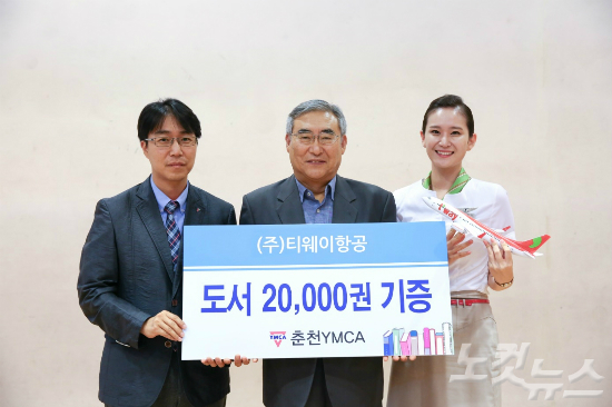 허대영 춘천YMCA 부이사장(가운데)과 티웨이항공 관계자들이 기념촬영을 하고 있다(사진=티웨이항공 제공)