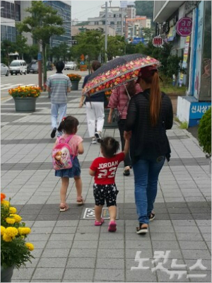 28일, 폭염특보가 닷새째 발효 중인 부산 사상구에서 한 어머니가 양산을 들고 아이들과 힘겹게 걷고 있다.(사진=부산CBS 강민정 기자)