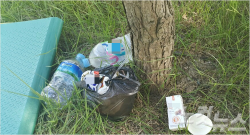 텐트를 칠 수 있는 다대포 해수욕장에서 불법 취사객들이 쓰레기를 버려놓고 간 모습(사진=부산CBS 강민정 기자)
