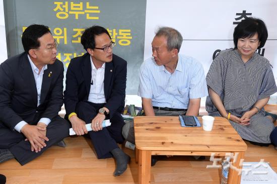 2일 오전 서울 광화문광장에서 세월호 특조위 활동기간 보장을 요구하며 단식농성 중인 이석태 위원장이 노성장을 방문한 박주민 의원 등 더불어민주당 의원들과 대화하고 있다.