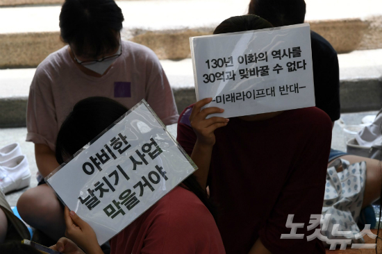 직장인 대상 평생교육 단과대학을 설립하려는 이화여대의 방침에 반발한 재학생과 졸업생들이 1일 오후 본관에서 점거농성을 했다. (사진=황진환 기자)
