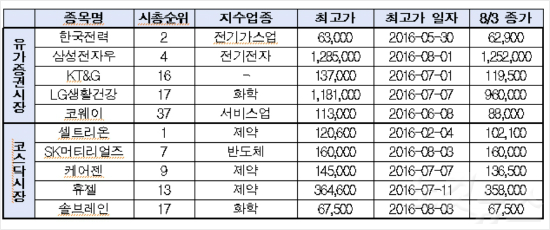 한국거래소가 2016년초부터 8월 3일까지 상장종목별 사상 최고가를 조사한 결과, 유가증권시장에서는 889 종목 중 10%인 89 종목이, 또 코스닥시장에서는 1,176 종목 중 15.5%인 182 종목이 사상최고가를 경신했다.