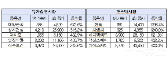 주가상승률이 가장 높은 종목은 유가증권시장에서 대양금속(672.6%), 코스닥시장에서는 한프(1,398.4%)로 나타났다.