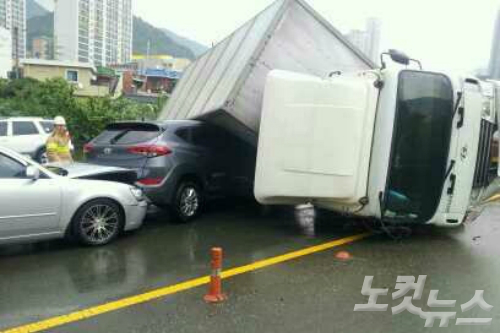 8일 오후 2시 5분쯤 부산 북구 만덕동 현대아파트 인근 남해고속도로에서 5t 트럭이 전복돼 반대편 차로를 덮쳤다.