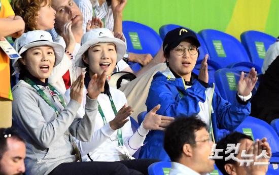 여자 양궁 개인전 32강전이 열리고 있는 8일(현지시간) 브라질 리우 마라카낭 삼보드로무 양궁경기장으로 응원을 나온 장혜진, 최미선이 기보배를 응원하고 있다.