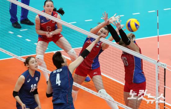 여자배구 대표팀 김희진이 8일 저녁(현지시간) 브라질 리우데자네이루 마라카낭지뉴 경기장에서 열린 여자배구 조별리그 2차전 러시아와의 경기에서 공격을 시도하고 있다.