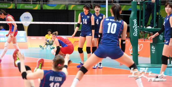 여자배구 대표팀 선수들이 8일 저녁(현지시간) 브라질 리우데자네이루 마라카낭지뉴 경기장에서 열린 여자배구 조별리그 2차전 러시아와의 경기에서 패한 후 아쉬운 표정을 짓고 있다. 한국 여자배구 대표팀은 러시아에 세트스코어 1대3으로 패해 1승 1패를 마크했다.
