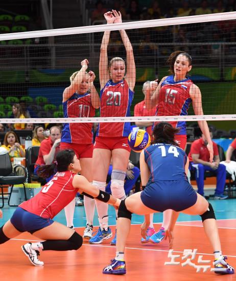 여자 배구대표팀 김해란이 8일 저녁(현지시간) 브라질 리우데자네이루 마라카낭지뉴 경기장에서 열린 여자배구 조별리그 2차전 러시아와의 경기에서 러시아 선수들의 블로킹에 맞고 떨어지는 공을 받아내고 있다. 한국 여자배구 대표팀은 러시아에 세트스코어 1대3으로 패해 1승 1패를 마크했다.