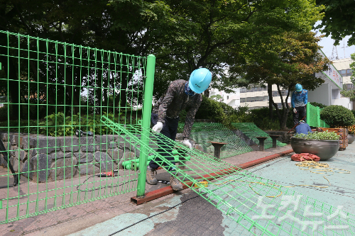 이 철제 펜스는 지난 2월 11일 옛 노인병원 노조원들의 천막농성장을 철거하는 행정대집행을 단행하며 청사방호를 목적으로 설치됐다.
