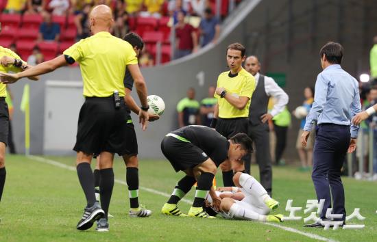 축구대표 황희찬이 10일 오후(현지시간) 2016년 리우올림픽 남자축구 C조 3차전 멕시코전이 열린 브라질 브라질리아 Mane Garrincha Stadium(마네 가힌샤 경기장)에서 멕시코 선수와 겹쳐 넘어지자 멕시코 선수가 사이드 라인으로 밀어버리고 있다.