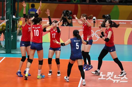 10일 오후(현지시간) 브라질 리우데자네이루 마라카나징유 경기장에서 열린 2016 리우 올림픽 여자배구 한국과 아르헨티나의 경기에서 한국 대표팀이 승리 후 환호하고 있다. 여자배구 대표팀은 아르헨티나를 세트 스코어 3-0 으로 제압하며 조별리그 2승 1패를 기록했다.
