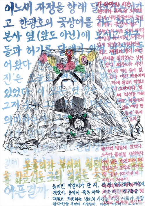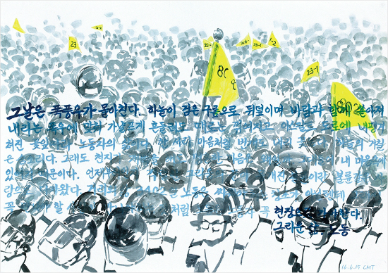 콜트 농성장·이대 시위 등 드로잉 … 치명타 작가 개인전 '뉴스피드'
